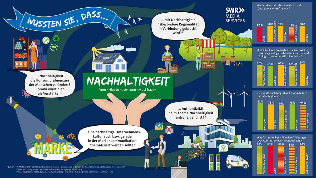 Auch vielen SWR-Hörer*innen ist das Thema Nachhaltigkeit beim Lebensmittelkauf wichtig: Knapp die Hälfte schaut laut Verbrauchs- und Medienanalyse (VuMA) auf Öko- bzw. Bio-Prüfsiegel. Auch Regionalität erfreute sich bei den SWR-Hörer*innen bereits vor der Corona-Pandemie einem besonderen Zuspruch. So gaben über 70 Prozent an, dass sie nach Möglichkeit Produkte aus der Region kaufen. Doch nicht nur bei den Lebensmitteln, auch beim Autokauf spielt Umwelt- und Klimaschutz für die SWR- Hörer*innen eine große Rolle. Über 85 Prozent geben an, dass Umweltfreundlichkeit und ein niedriger CO2 Ausstoß als Kaufkriterium wichtig sind.