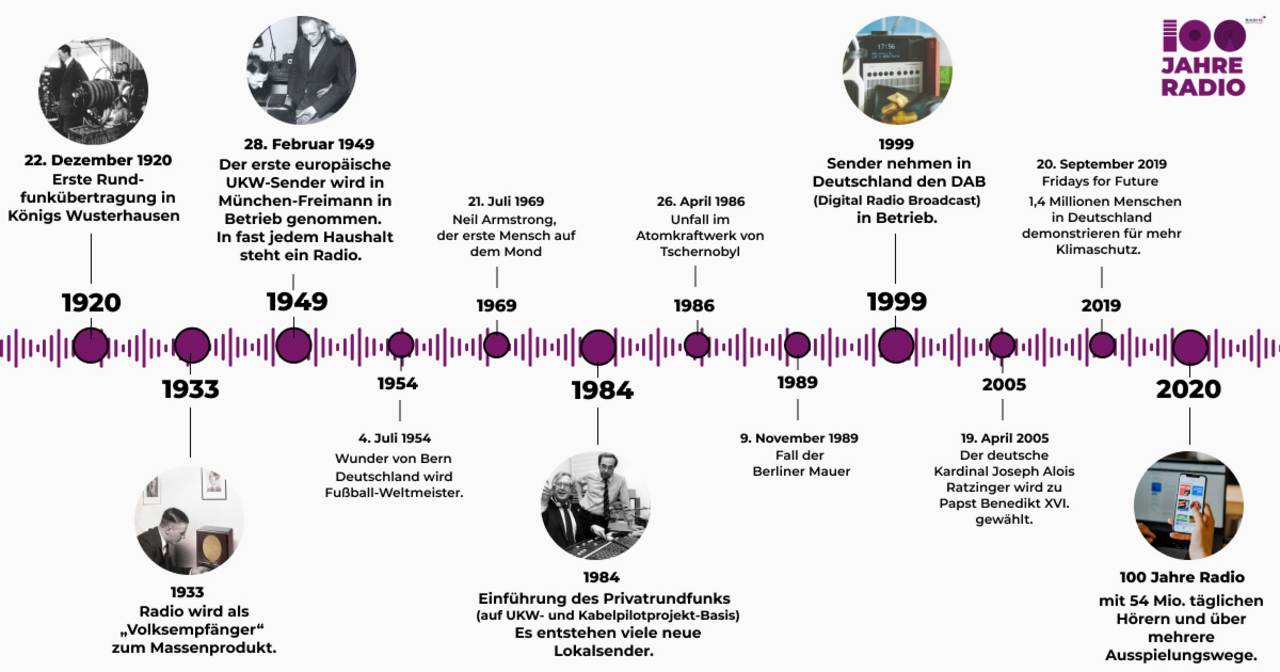 Am 22. Dezember 1920 fand in Königs Wusterhausen auf dem Funkerberg die erste deutsche Rundfunkübertragung statt. Dieser Tag ist somit die Geburtsstunde des Radios in Deutschland und der Startschuss einer bewegenden Geschichte, die seit 100 Jahren jedes historische Ereignis, ob freudig, politisch, brisant, epochal, emotional, beeindruckend oder kurios begleitet, kommentiert und einordnet. Sei es der WM-Gewinn der Fußballnationalmannschaft 1954, das Woodstock-Festival und der erste Mensch auf dem Mond im Jahr 1969, der Mauerfall 1989, 2005 die Wahl von Angela Merkel als erste Bundeskanzlerin oder die Fridays for Future-Bewegung und, und, und.... Radio hat immer Worte gefunden, um Geschichte greifbar zu machen und Distanzen aufzuheben. Radio war und ist im besten Sinne das auditive Tor zur Welt.