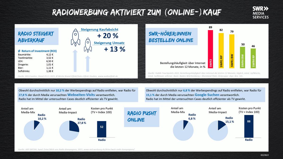 ROI-Counter: www.ard-media.de/radio/gute-gruende-fuer-radio/radio-aktiviert-und-verkauft/, www.audioeffekt.de