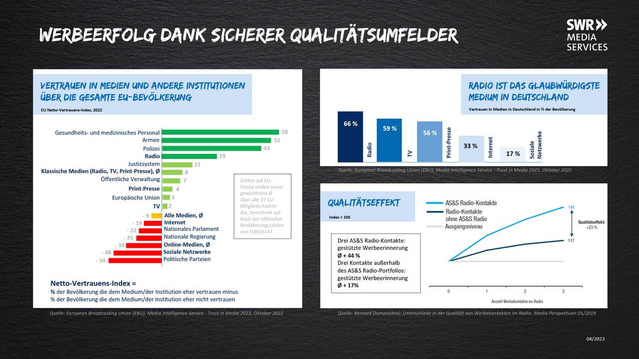 Die Radioprogramme des SWR bieten Werbekunden ein optimales Werbeumfeld. Radio ist das vertrauens- und glaubwürdigste Medium. Studien zeigen, dass sich die Wertschätzung für ein Medium ungebrochen auf die dort werbenden Unternehmen überträgt. Neuesten Zahlen der European Broadcasting Union (4) zufolge schätzen 66 Prozent der Bundesbürger*innen Radio als vertrauenswürdig ein – der mit Abstand höchste Wert unter allen Medien. Das Fernsehen folgt mit 59 Prozent, Print mit 56 Prozent, das Internet mit 33 Prozent und die sozialen Netzwerke weit abgeschlagen mit nur 17 Prozent. In einer Langzeitstudie von ARD und ZDF (5) sprachen die Befragten den öffentlich-rechtlichen Radioanbietern zudem eine um 24 Prozentpunkte höhere Glaubwürdigkeit zu als den privaten Radiostationen.