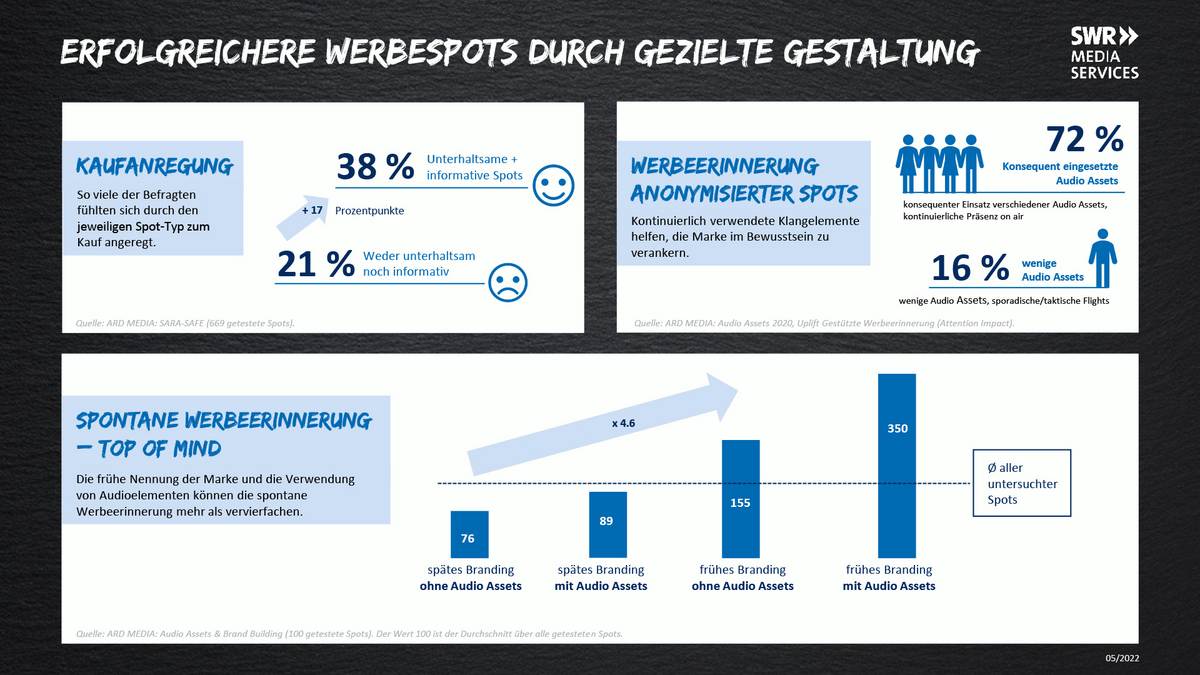 Die Analyse erfolgreicher Spots zeigt bestimmte Kriterien und Muster, an denen Werbeprofis sich bei der Spotkreation orientieren können. So spielen der Informationsgehalt - die vermittelten Sachinformationen sowie Verständlichkeit und Glaubwürdigkeit der Botschaft - und der Unterhaltungswert - Kreativität, Originalität und Emotionalität - eine wesentliche Rolle, wie Ergebnisse der Spot-Analyse Radio (SARA) der ARD MEDIA von rund 700 Radiospots zeigen. Danach erzielten Werbespots, die sowohl als überdurchschnittlich informativ als auch als überdurchschnittlich unterhaltsam wahrgenommen wurden, die höchste Werbewirksamkeit: Die Kaufanregung lag bei Spots, die beide Kriterien erfüllten, um 17 Prozentpunkte höher als bei Spots, die weder als informativ noch als unterhaltsam bewertet wurden.