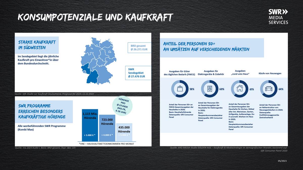 Die Zielgruppe 50+, die für den größten Teil der tatsächlichen Konsumausgaben verantwortlich ist, lässt sich mit den werbungführenden SWR-Programmen hervorragend erreichen. Mehr als 1,3 Mio. Hörende pro Durchschnittsstunde gehören der Generation 50+ an (2).