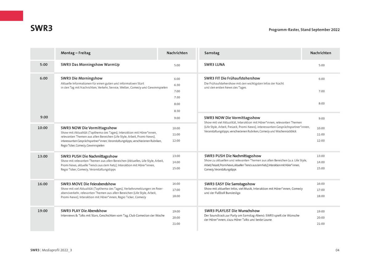 Das SWR3 Mediaprofil mit den aktuellen Mediazahlen und Preislisten steht Ihnen hier als PDF zur Verfügung: