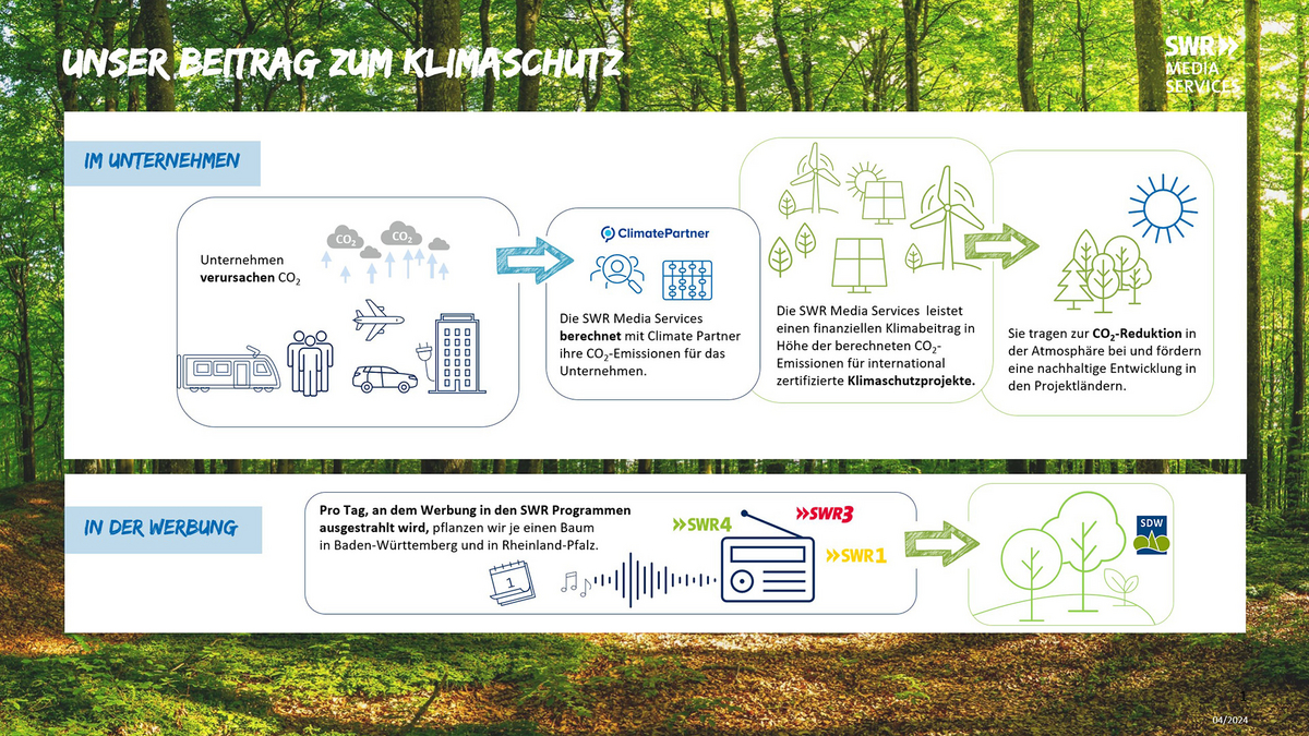Unternehmen, die in den SWR Programmen werben, werben hier nachhaltig. Denn neben dem finanziellen Klimabeitrag, engagiert sich die SWR Media Services regional. Außerdem werden Hörer*innen erreicht, die überdurchschnittlich an Nachhaltigkeit und Regionalität interessiert sind. Die SWR Media Services unterstützt bereits seit mehreren Jahren vielfältige Klimaschutzprojekte und die Kinderhilfsaktion Herzenssache e.V..