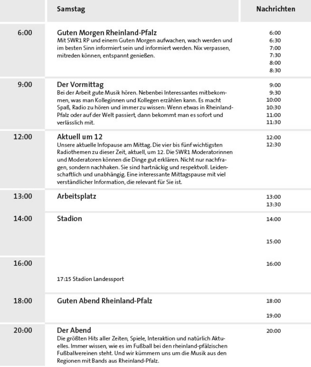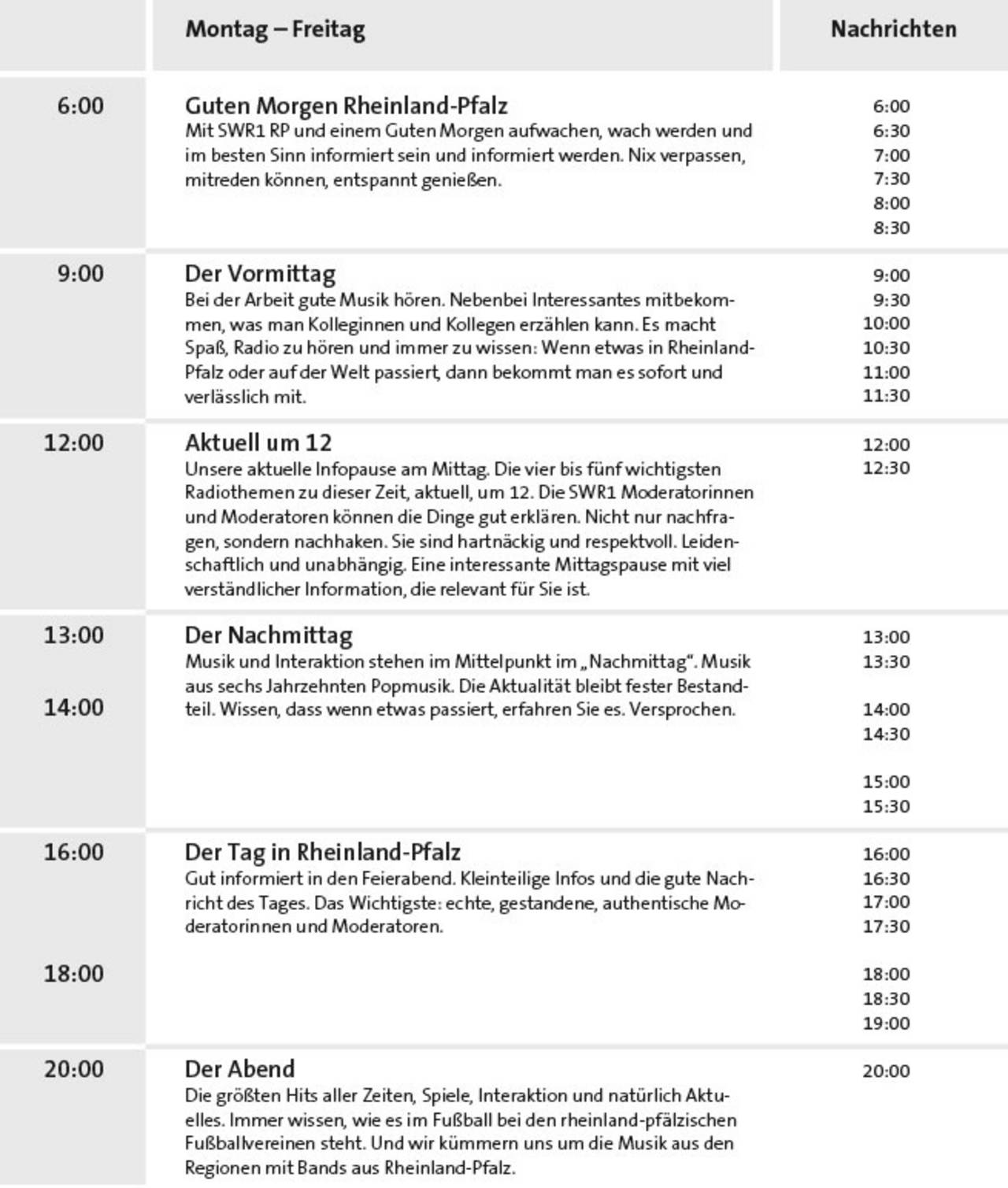 SWR1 Rheinland-Pfalz versteht sich als Informationsleitmedium für das Bundesland Rheinland-Pfalz. Ein Radioprogramm, bei dem Inhalte im Vordergrund stehen: Informationen, Service und das aktuelle „Thema heute“.