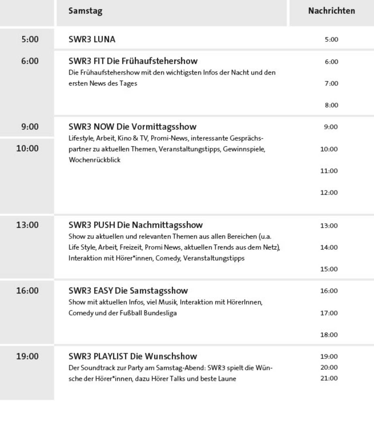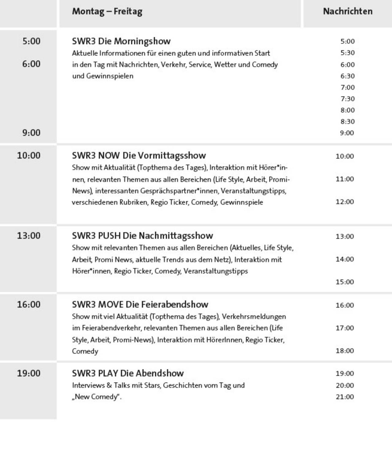 Die multimediale Marke SWR3 ist besser, schneller, frecher und innovativer als andere und seit Jahren in der Spitze der deutschen Radioprogramme. Die Popwelle begleitet ihre Hörer mit dem besten Musikmix, den schnellsten Informationen aus SWR3-Land, Deutschland und der Welt, detailliertem Wetter- und Verkehrsservice und kultiger Radio-Comedy.